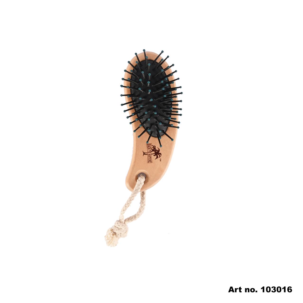 This compact wooden hair brush is perfect for everyday use or travel. It features rounded bristles that gently detangle hair without pulling, making it great for all hair types. The natural wooden handle is easy to grip, and the rope loop makes it simple to hang or carry. Small in size, big on comfort!